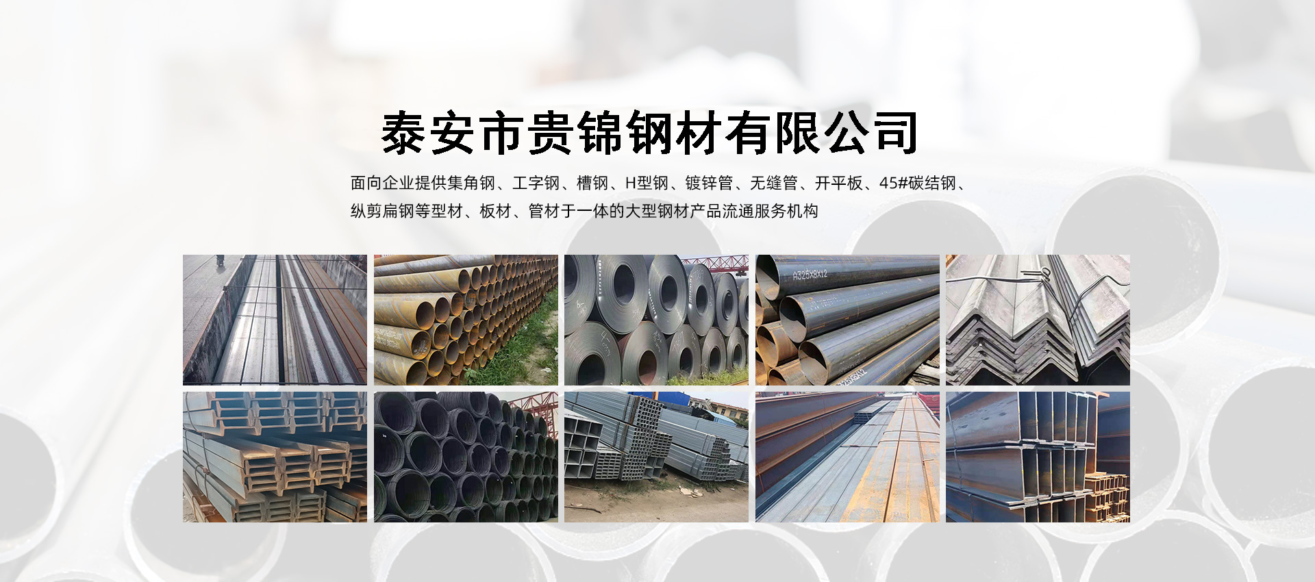 泰安市贵锦钢材有限公司是一家面向企业提供集角钢、工字钢、槽钢、H型钢、镀锌管、无缝管、开平板、45#碳结钢、纵剪扁钢等型材、板材、管材于一体的大型钢材产品流通服务机构,泰安市贵锦钢材有限公司坐落于驰名中外的泰山脚下、泰山钢材大市场,公司是莱钢H钢、日钢H钢、津西H钢、鞍山宝得、山东传洋角钢、鲁阳钢厂、唐钢、天津皮特斯角钢、天津江天槽钢等各大钢厂重点经营客户。