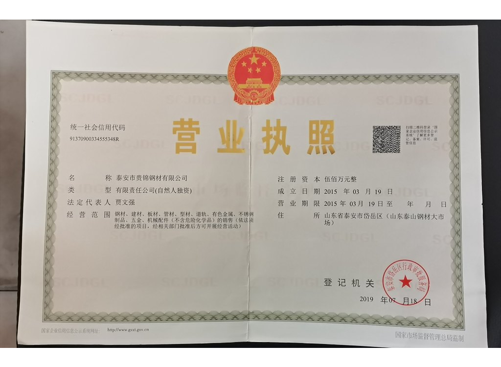 泰安市贵锦钢材有限公司是一家面向企业提供集角钢、工字钢、槽钢、H型钢、镀锌管、无缝管、开平板、45#碳结钢、纵剪扁钢等型材、板材、管材于一体的大型钢材产品流通服务机构,泰安市贵锦钢材有限公司坐落于驰名中外的泰山脚下、泰山钢材大市场,公司是莱钢H钢、日钢H钢、津西H钢、鞍山宝得、山东传洋角钢、鲁阳钢厂、唐钢、天津皮特斯角钢、天津江天槽钢等各大钢厂重点经营客户。